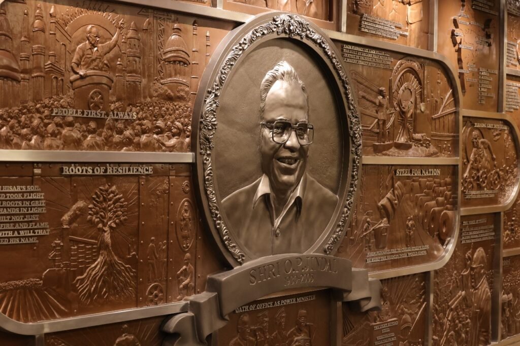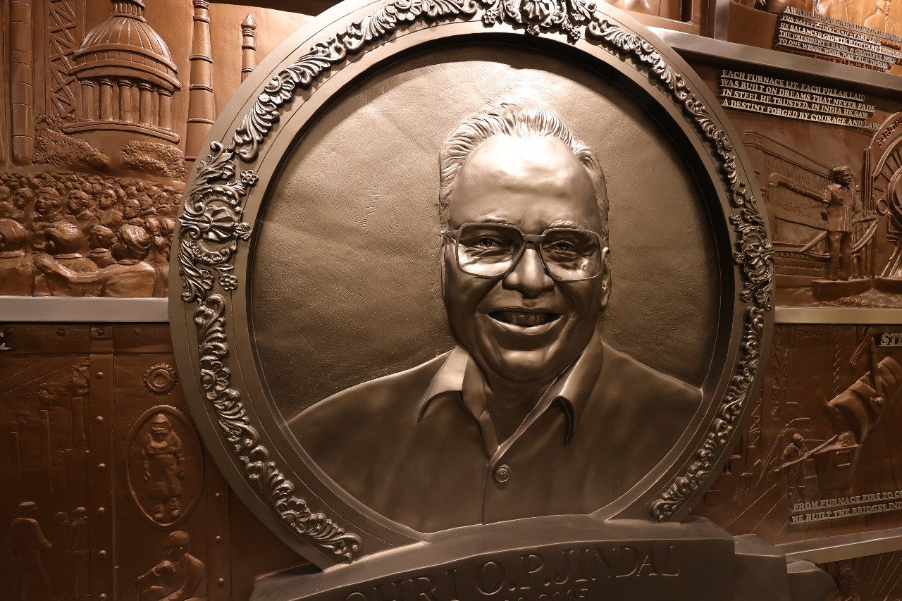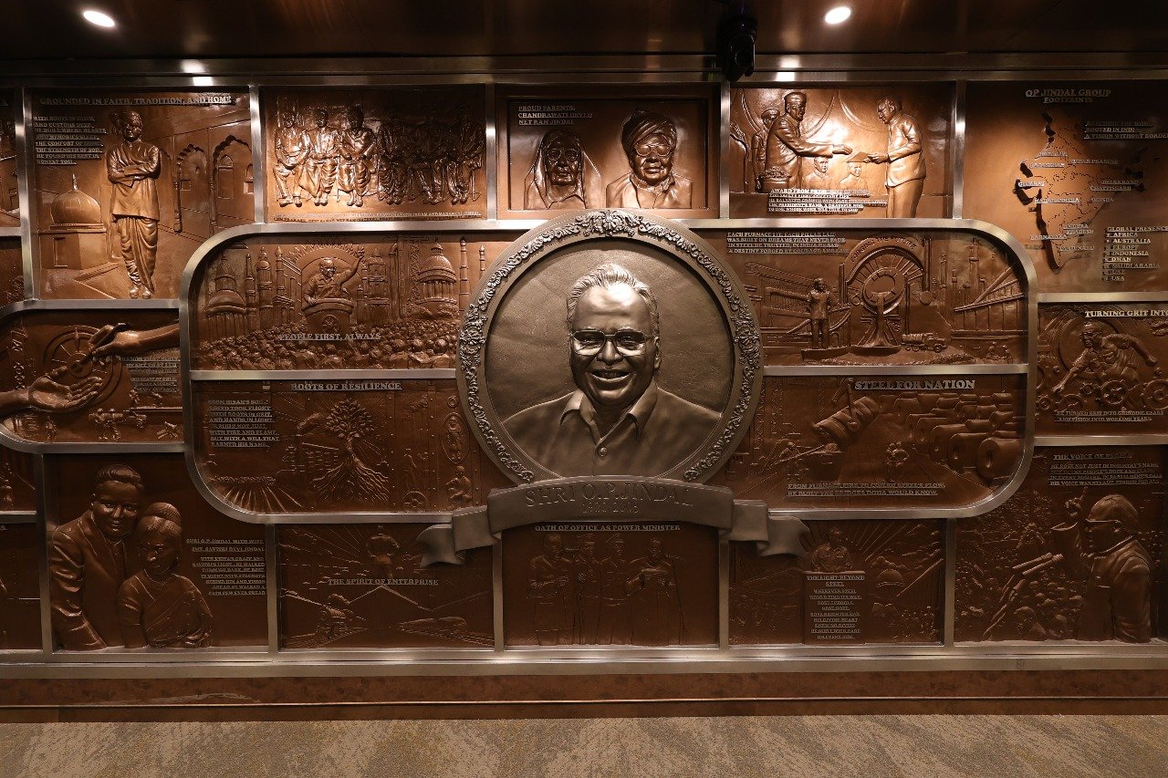 The second mural was conceived as a more text-driven and sculptural narrative. It features a full-figure high relief sculpture of Shri O.P. Jindal Ji at the center, surrounded by etched text that encapsulates his entire journey and philosophy.