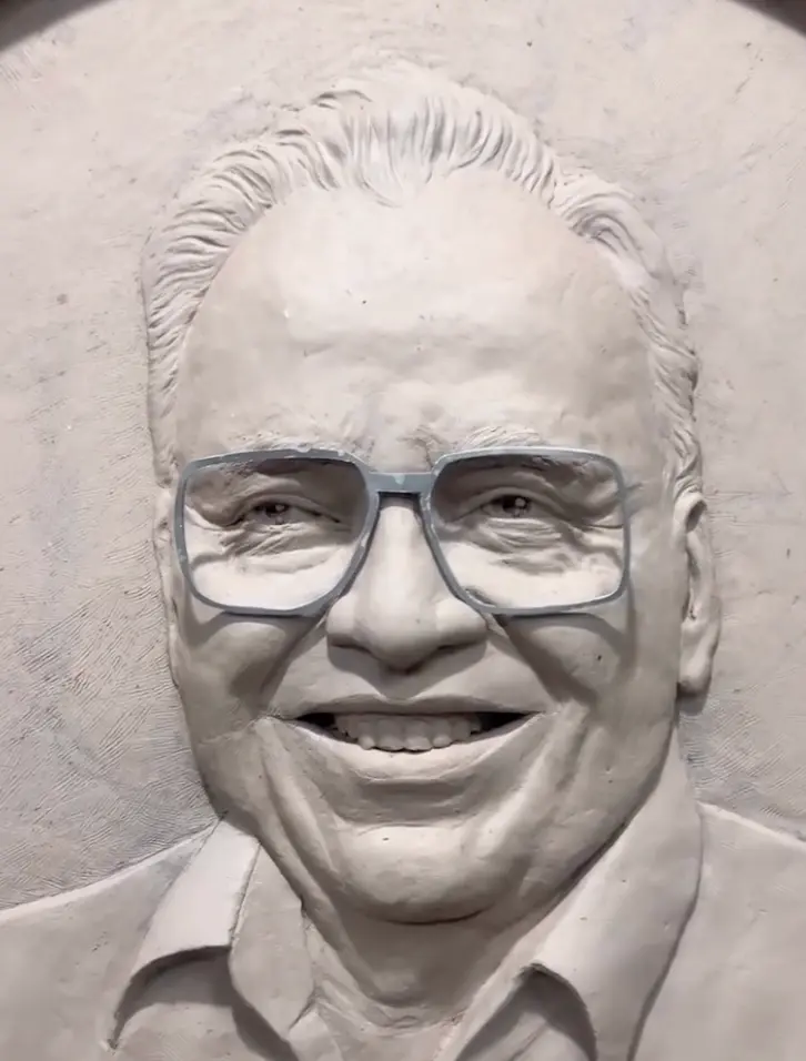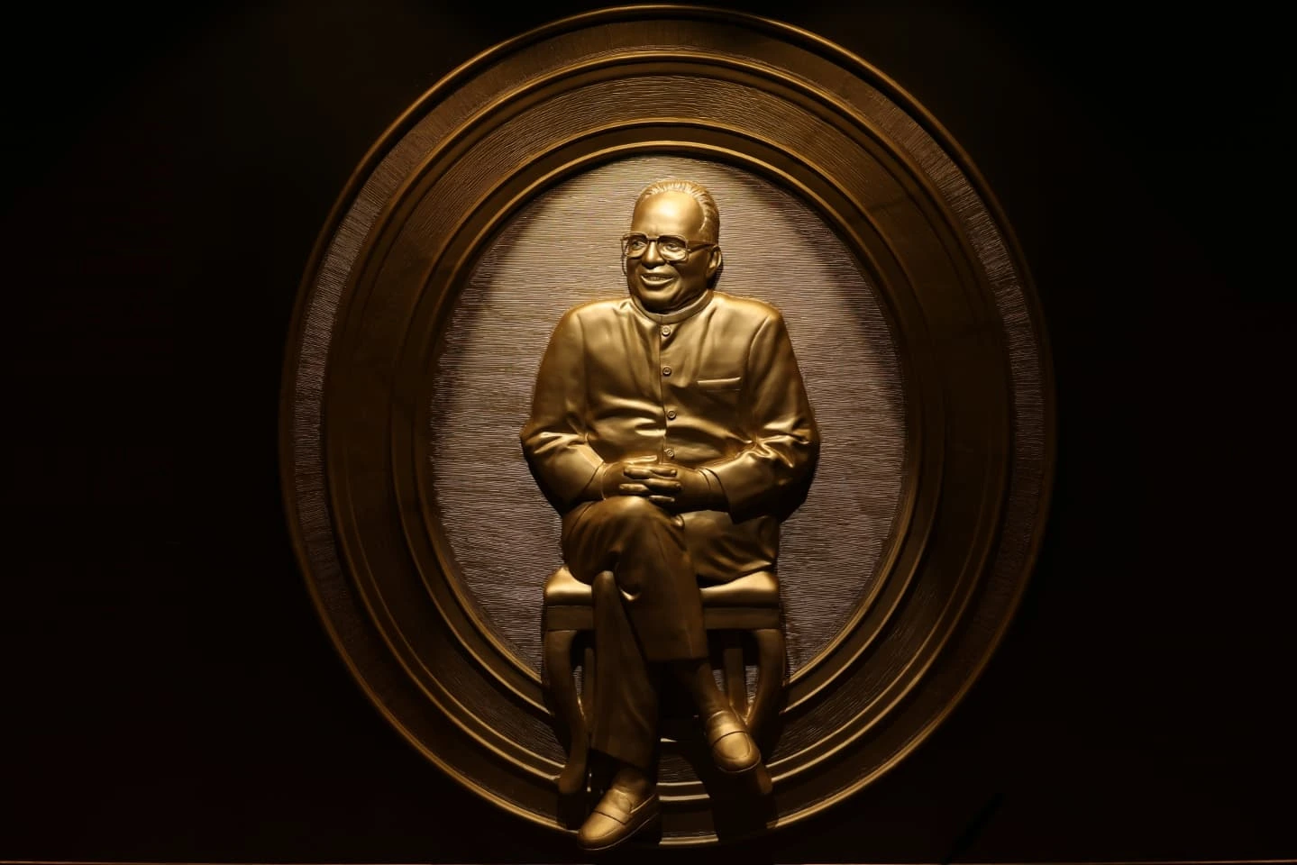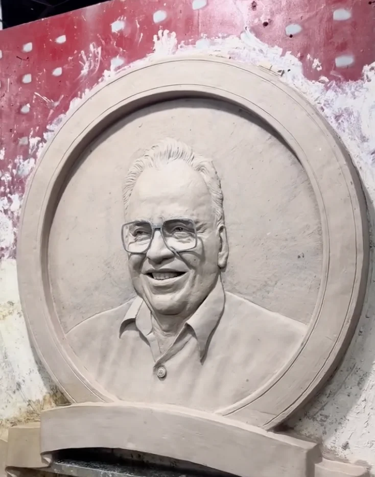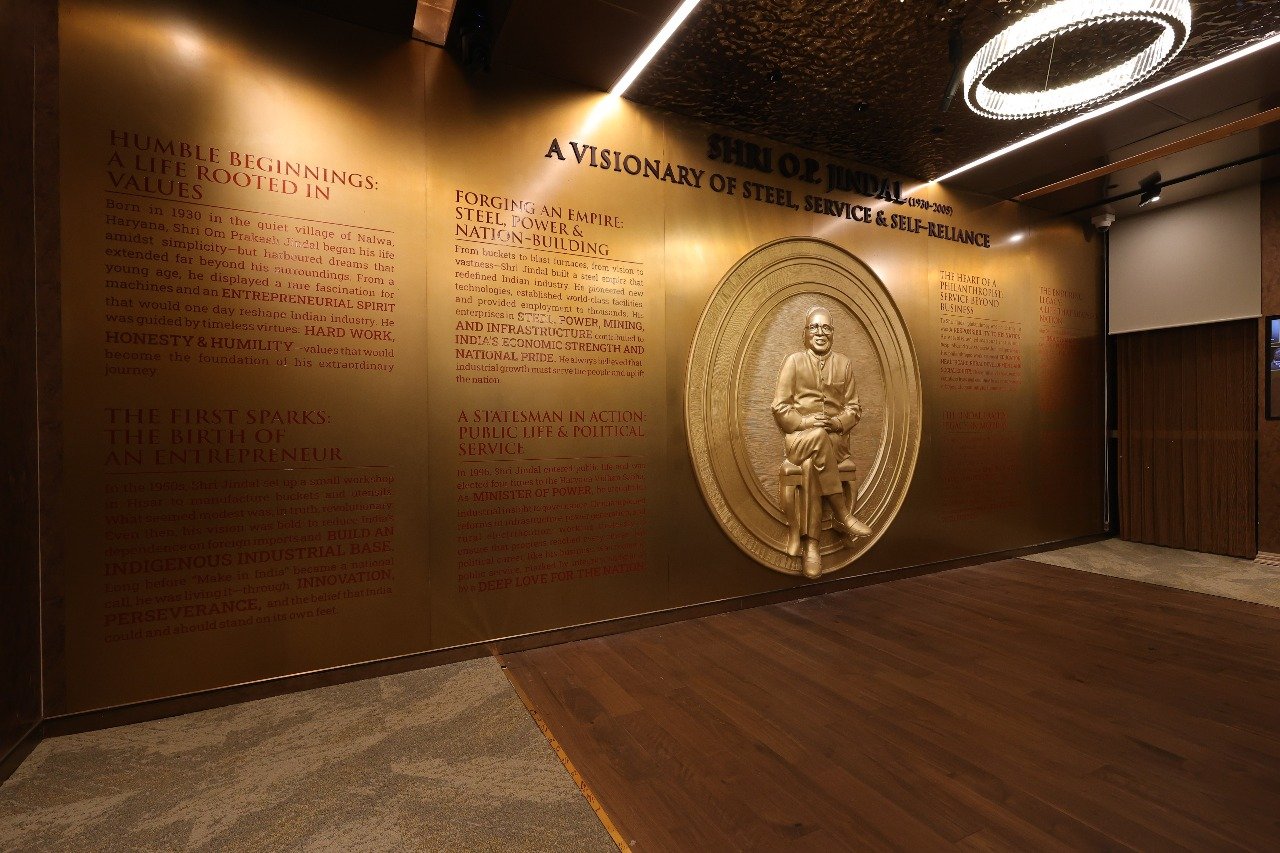 The second mural was conceived as a more text-driven and sculptural narrative. It features a full-figure high relief sculpture of Shri O.P. Jindal Ji at the center, surrounded by etched text that encapsulates his entire journey and philosophy.
